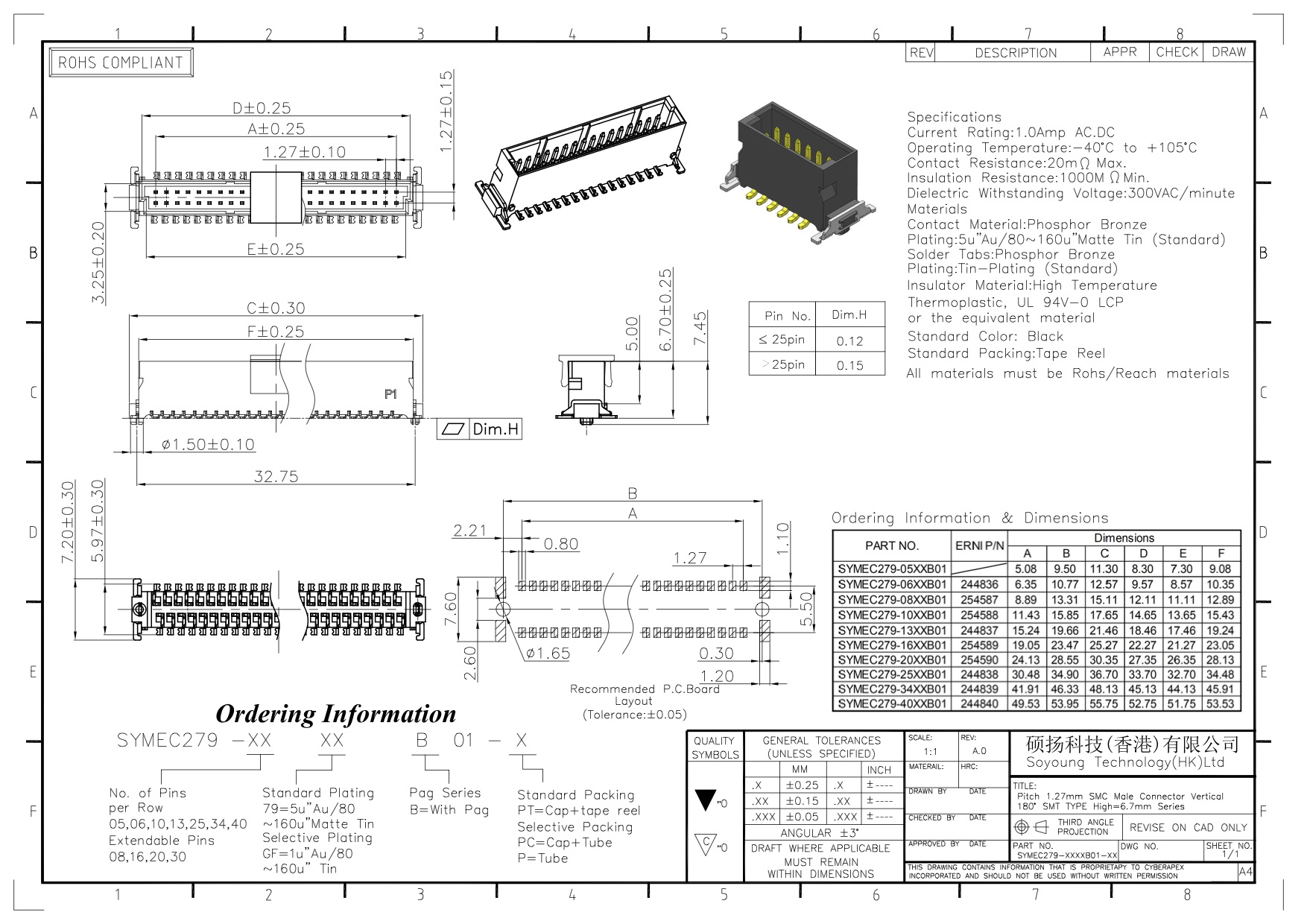 SYMEC279-B01 1.27mm SMC Male Connector Vertical SM...